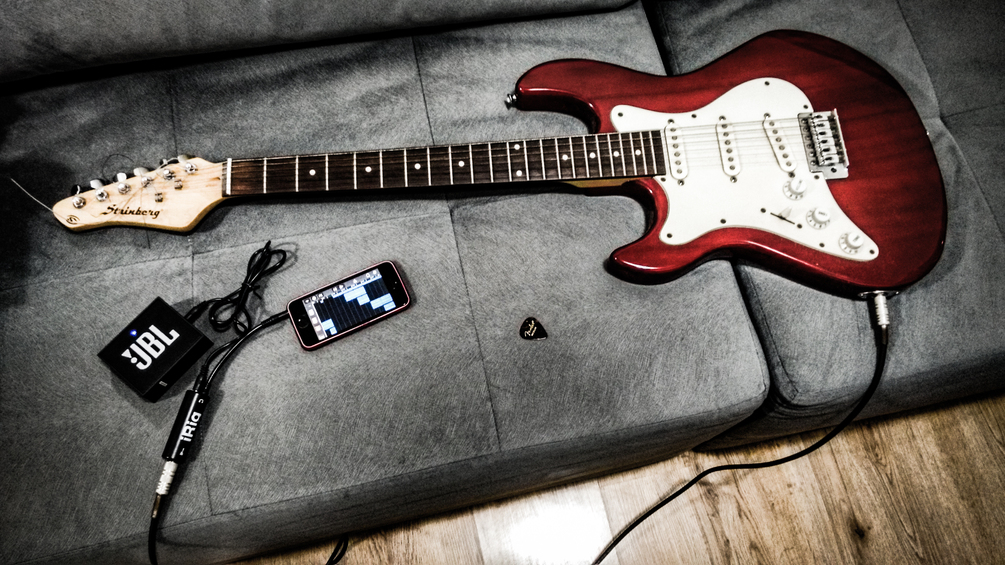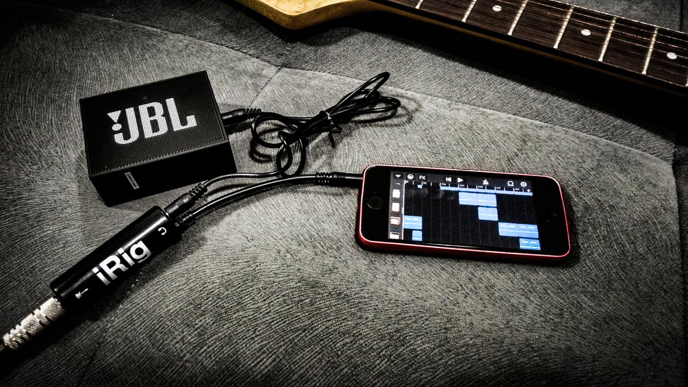 Para isso, utilizei o app GarageBand da Apple e pluguei a guitarra no celular com a ajuda de uma interface de áudio.